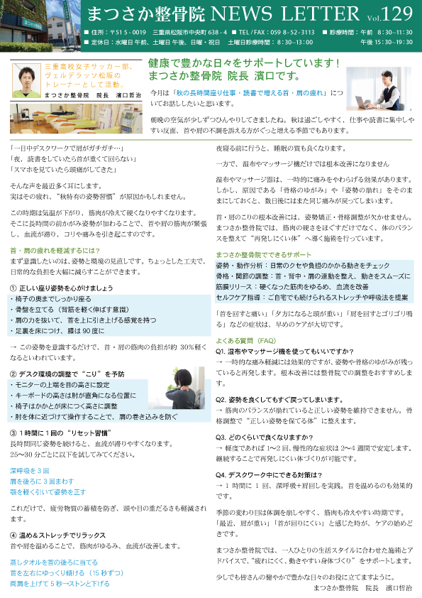 今月は「秋の長時間座り仕事・読書で増える首・肩の疲れ」についてお話ししたいと思います。